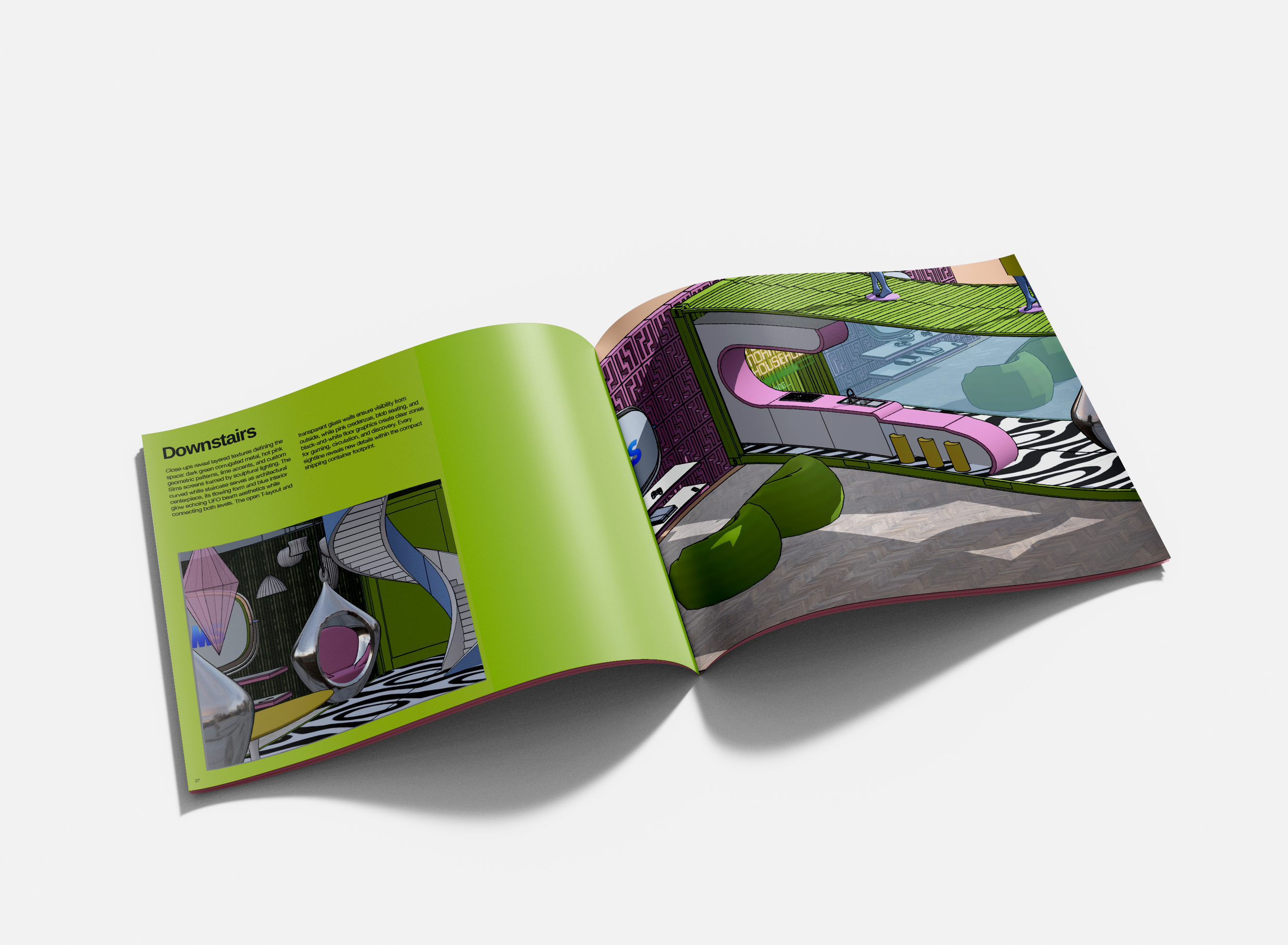 A conceptual pop-up exhibit and companion booklet built around an imagined collaboration between drag artist Juno Birch and The Sims. Two shipping containers are transformed into an immersive environment drawing on Space Age design, mid-century modernism, and camp maximalism — rendered in SketchUp and documented through a fully designed editorial booklet produced in Adobe InDesign. A project that lives at the intersection of experiential design, brand collaboration, and storytelling.